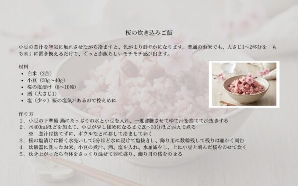 桜の塩漬けは、お弁当、おかず、おつまみ、デザート、と様々に活用できるので、