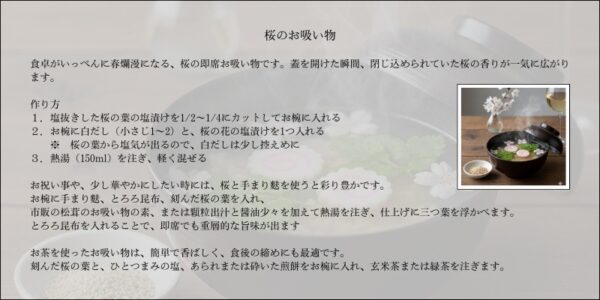 サクラの料理に簡単なお吸い物も添えたら、桜づくしのコース料理が完成です