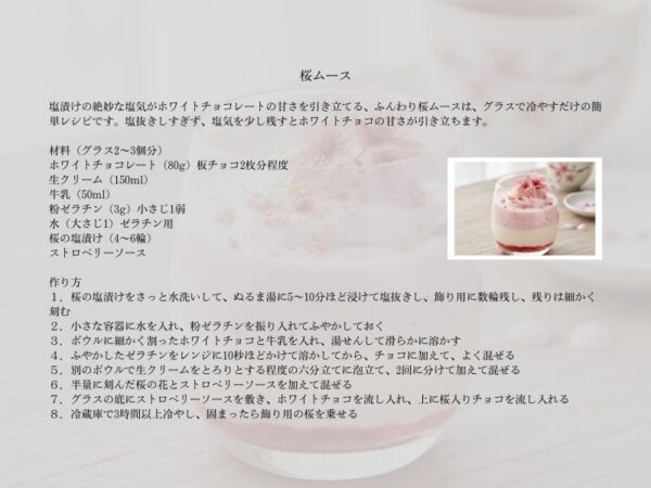 塩漬けした桜の花とホワイトチョコレートのムースは、