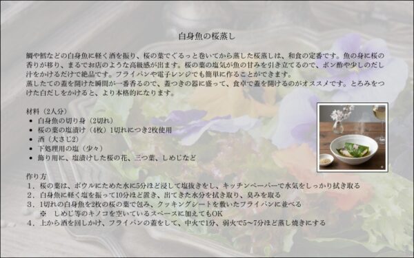 鯛や鱈などの白身魚に軽く酒を振り、桜の葉でぐるっと巻いてから蒸した桜蒸しは、和食の定番です