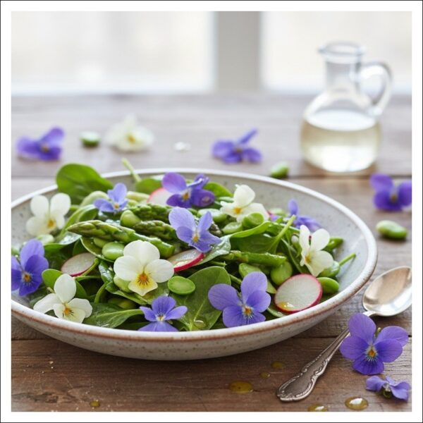 ベビーリーフ、アスパラガス、ソラマメなどの春野菜に、スミレの花を散らしたサラダ