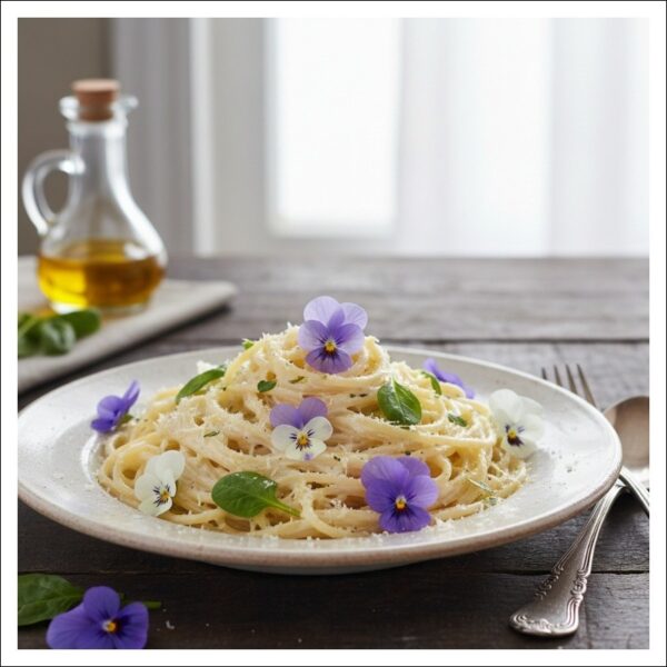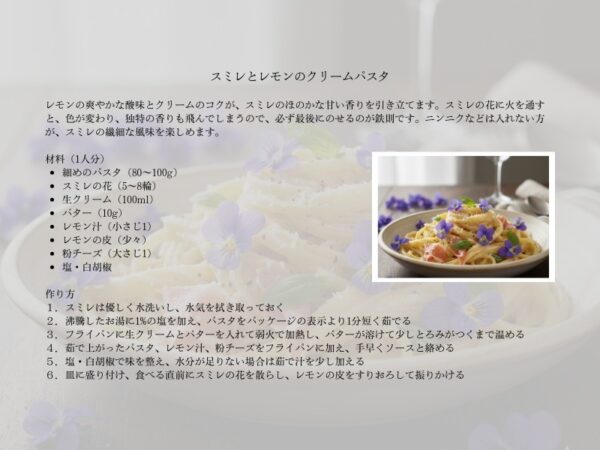 シンプルでクリーミーなパスタは、スミレの繊細な香りを活かせる、華やかな料理です